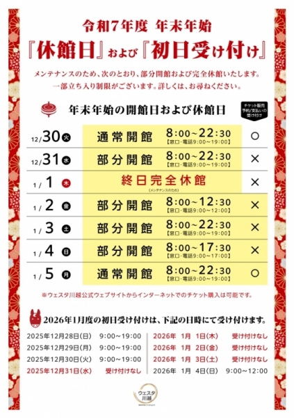 年末年始休館日および2026年1月度 初日受け付けのご案内