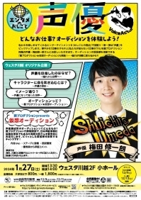 | 詳細 | 1月20日更新 ウェスタ川越 オリジナル企画 エンタメのおしごと『声優』 どんなお仕事?オーディションを体験しよう! 私たちを楽しませてくれるエンターテインメントを『おしごとの視点』で深掘り!第一弾は『声優』をピックアップします。華やかな『仕事のオモテ』と私たちが知らない『仕事のウラ』を賢プロダクション所属の声優・梅田修一朗さんにお話しいただきます。オーディションの緊張感を体験できる『賢プロダクション★仮想オーディション』も実施!・・・憧れが目標に変わるかも?! \賢プロダクションpresents 仮想オーディション/ ■参加資格:当日入場チケットをお持ちの方どなたでも ■参加方法: ①当日、入場口に設置する「エントリーカード」に記入して、BOXに投函してください。 ②開演後、司会者が会場で抽選を行います。 ③当選した方にオーディション原稿をお渡しします。(朗読オーディション) ④公演の後半に、仮想オーディションを開催!梅田修一朗さんと内海賢太郎さん(賢プロダクション 代表取締役、日本声優事業社協議会理事長)の講評をいただきます! 多くの方のチャレンジをお待ちしています。 ※未就学のお子様のご入場はご遠慮ください。 ※大学生以下のチケットはご入場時に学生証等を確認させていただく場合がございます。ご協力ください。 ※やむを得ない事情により、出演者・内容等が変更になる場合がございます。 ※公演中止の場合を除き、お買い求めいただきましたチケットのキャンセル・変更はできません。 ※最新の情報はウェスタ川越公式ウェブサイトにてお知らせいたします。 主催:指定管理者NeCST[川越市提案事業] 協力:一般社団法人 日本声優事業社協議会(JSYCC) ********** \WM会員特典①/ この公演は、いつもウェスタ川越を応援してくださっている”ウェスタ川越ウェブメンバーズ”会員様へスペシャルな特典をご用意した公演です。 特典 : チケット先行販売(先着)*受付を終了しました。 12/9(土)12:00 ~ 12/11(月)23:59まで https://p-ticket.jp/westa-kawagoe ********** \WM会員特典②/ こちらの公演は、ウェスタ川越webメンバーズ会員限定「会場お渡しオリジナルグッズ」対象公演です。 詳細はこちら |