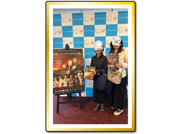 市村正親さん出演の「屋根の上のヴァイオリン弾き」を、母と観覧しました。母にとっては人生初めてのミュージカルです。始まるまでは落ち着かない母でしたが、市村さんが登場した途端に大きな拍手が起こり、一気に引き込まれました。横に座っている母は、少女のように目をキラキラと輝かせ、時には声を上げ喜び驚き、ため息を漏らします。一瞬にして十九世紀末帝政ロシアの時代に引き込まれ、同じ時を生きているようでした。公演終了後、役者の方々の演技が自然で音楽も心地良く、賑やかな雰囲気が広がって伝わった! 等々、興奮して感想を早口で話し、またこんなミュージカルを観てみたいと言ってもらえたのがとても嬉しかったです。母がまたこのような経験をしてみたいと思えたのは、ウェスタ川越が観覧前からとても居心地よく、親しみやすく迎え入れてくれる雰囲気を持っているからだと感じました。またぜひ観劇の機会を持ちたいと思います!