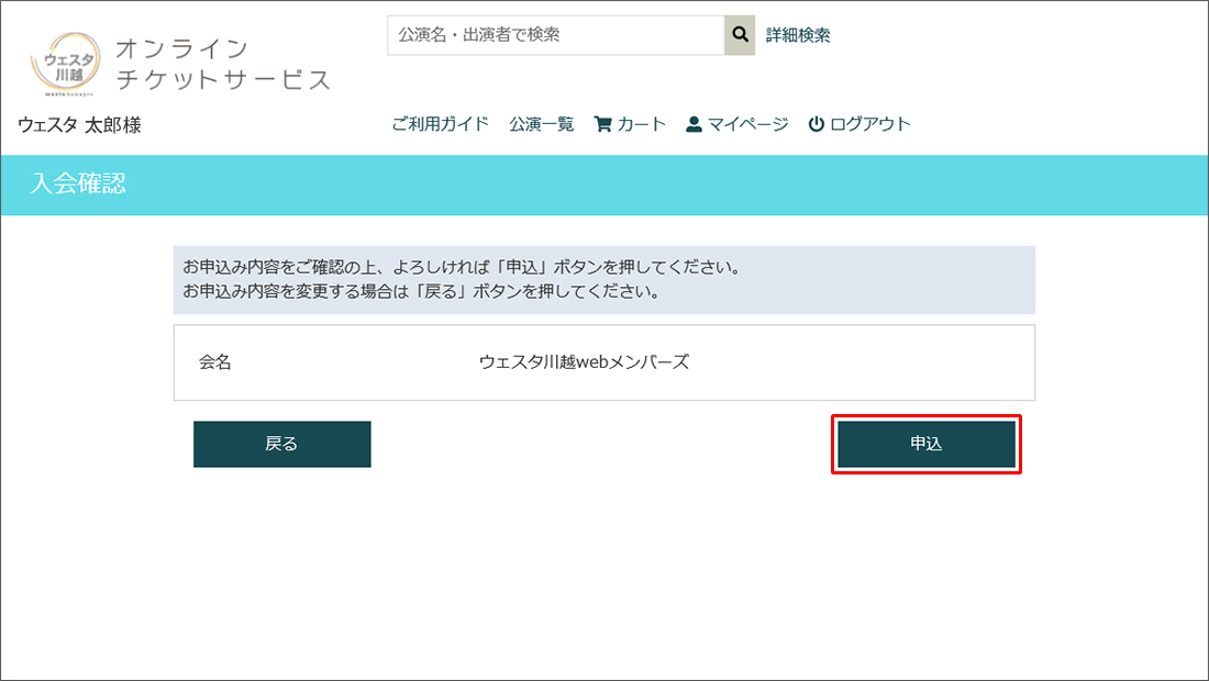 - 『ウェスタ川越webメンバーズ』のご入会前に、チケット予約システム『ウェスタ川越オンラインチケットサービス』の利用登録(無料)が必要です。